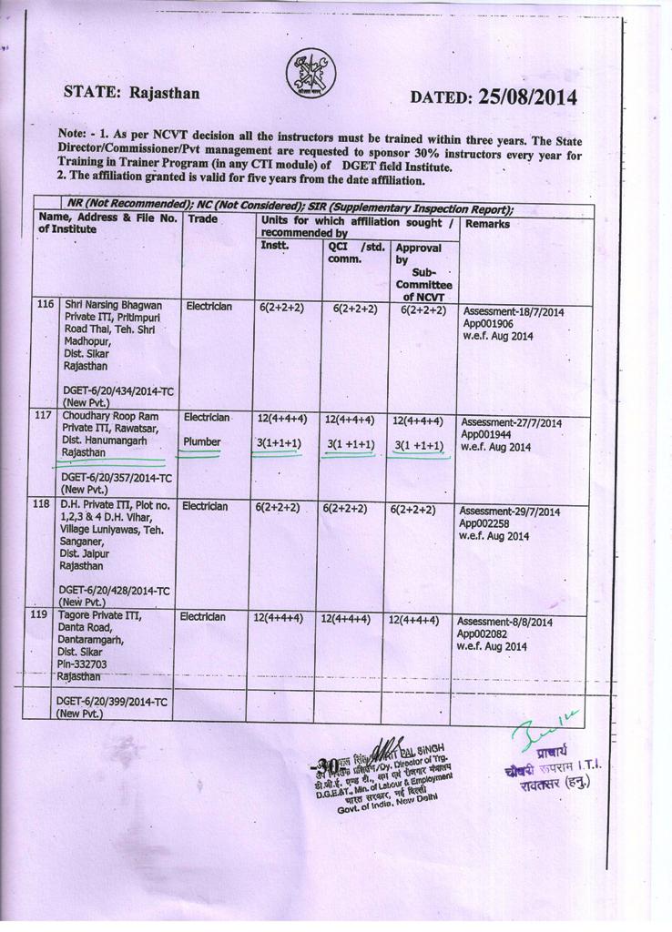 | Name of the Institute | Choudhary Roop Ram Pvt ITI Rawatsar, Hanumangarh |
